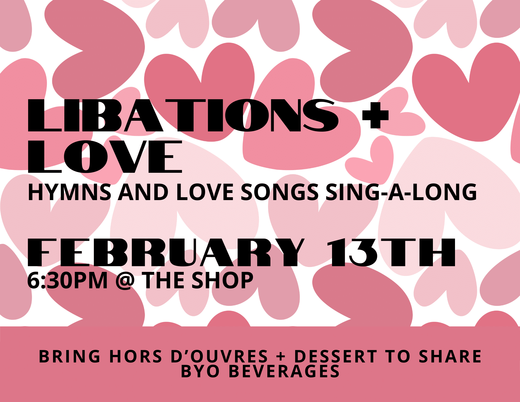 Join us February 13, 2026 at 6:30pm for an evening of libations and a love songs and hymns singalong! Hosted at The Ehrhardt’s Shop, all-ages are welcome. Please bring an appetizer and a dessert; BYOB.